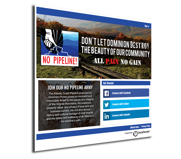 There is only one way to eliminate the Atlantic Coast Pipeline’s threat to our drinking water, our small businesses and property, our treasured recreational and historic sites, and our peace of mind. The All Pain, No Gain Campaign seeks to unite all Virginians to work together with state and federal officials to ensure that public interests are protected in Dominion’s plan for a natural gas pipeline in the Commonwealth. We must stop Dominion from pursuing their proposed route for the Atlantic Coast Pipeline and require them to identify a more responsible alternate route.